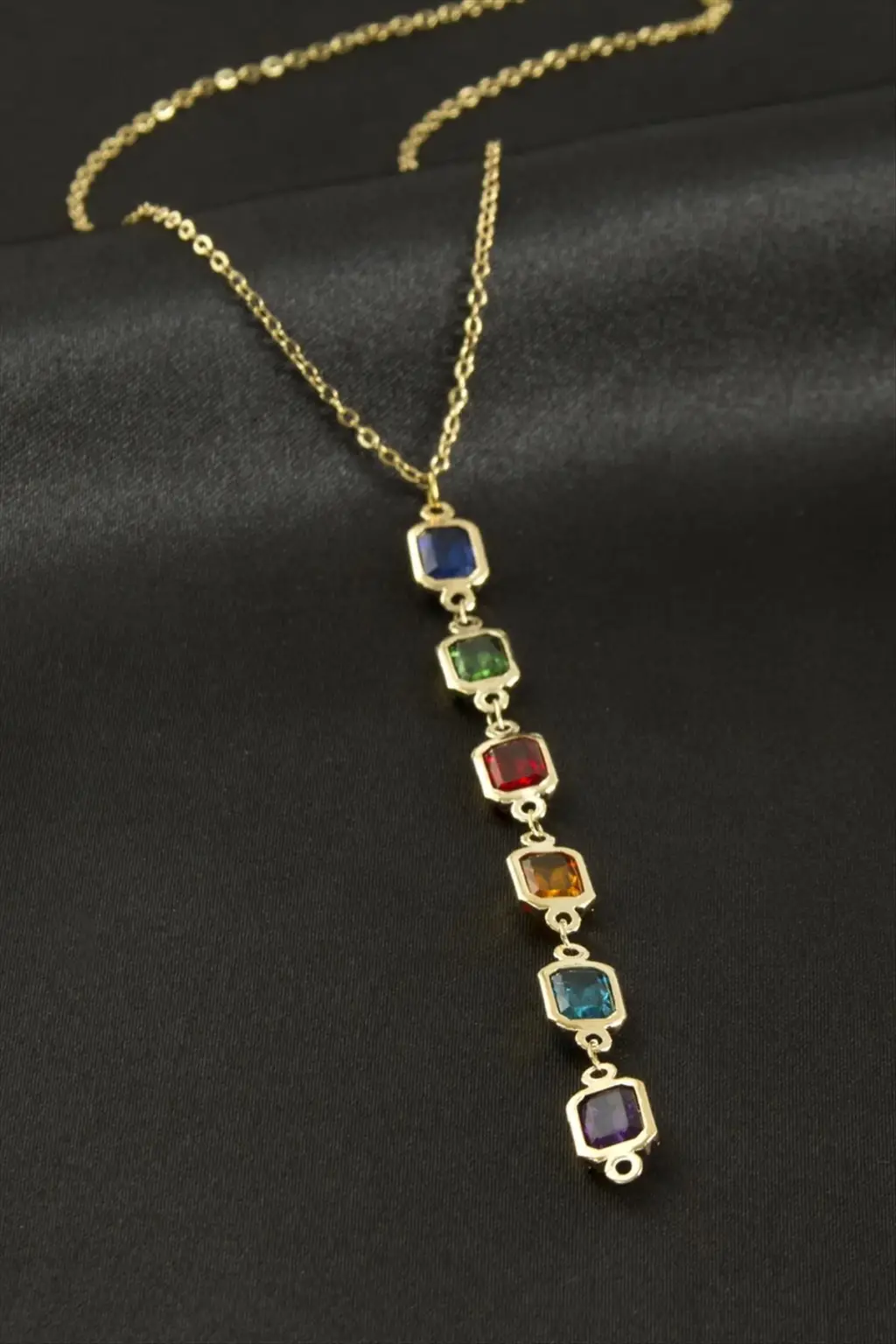 Kolye; Ürün malzemesi kristal taş ve çeliktir. Zincir uzunluğu 45 cmdir. Ürün ucunda sallantılı kristal taşlar vardır.