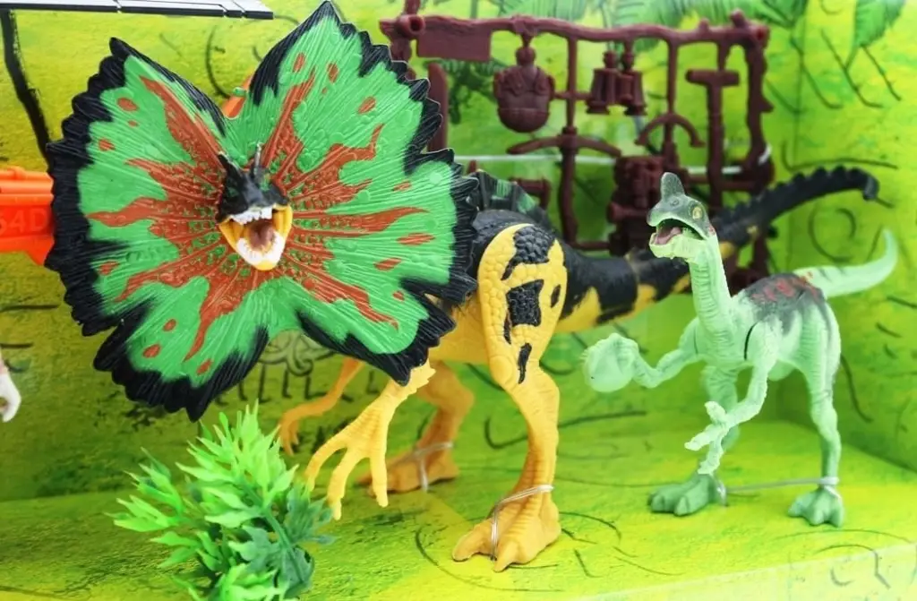Dilophosaurus boyu 23 cm dir. Ön ve arka ayakları hareketlidir. Boynu ve kafası hareketlidir.