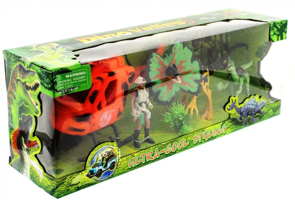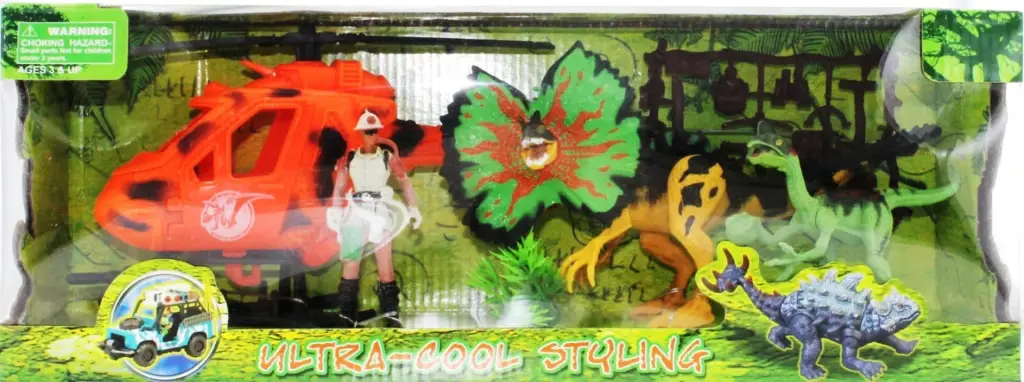 Set içerisinde helikopter, dilophosaurus dinozor, küçük bir dinozor, insan figürü, çeşitli kazı malzemeleri ve çalılar bulunmaktadır.
