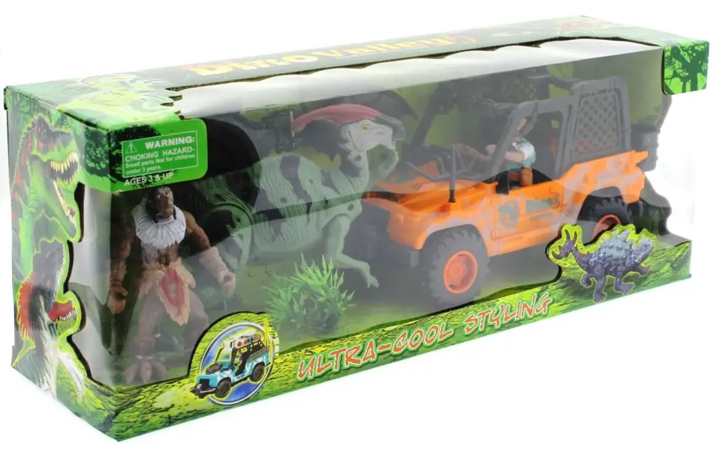 Set içerisinde jeep, parasaurolophus dinozor, tarih öncesi insan figürü, savaş baltası, takma kanat, modern insan figürü ve çalılık mevcuttur.