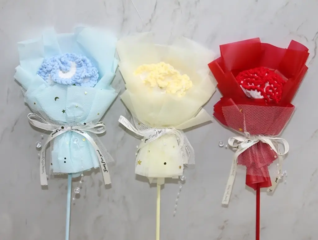 EL ÖRGÜSÜ TEKLİ ÇİÇEK BUKETİÜrün ÖzellikleriEl Örgüsü Tekli Çiçek Buketi, zarif tasarımı ve el emeği dokusuyla dekoratif amaçlı kullanılabilen şık bir aksesuardır. 37 cm boyutundaki kompakt yapısı sayesinde masa üstü düzenlemelerinde, hediye sunumlarında, özel gün kutlamalarında ve fotoğraf çekimi konseptlerinde estetik bir tamamlayıcı olarak tercih edilir. Örgü çiçeğin yumuşak dokusu ve tül kaplamalı dış formu ürüne romantik ve sevimli bir görünüm kazandırırken, sap kısmındaki kurdele detayı hediye sunumu için ideal bir şıklık sağlar. El işçiliğiyle üretildiği için her bir buket kendine özgü bir karakter taşır. Renk seçimi yapılamaz; görseldeki renklerden biri olarak gönderilir. Hem el yapımı ürün sevenler hem de dekoratif çiçek arayanlar için ideal bir tercihtir.Paket İçeriği1 adet El Örgüsü Tekli Çiçek Buketi