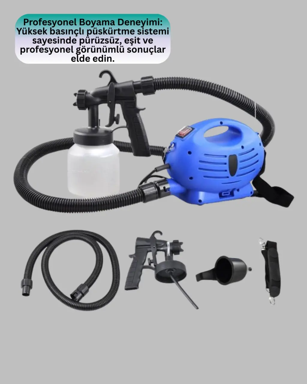 Bu elektrikli boya püskürtme makinesi, ev dekorasyonu ve profesyonel uygulamalar için geliştirilmiş üstün performanslı bir cihazdır. 800W güçlü motoru sayesinde boyayı yüksek basınçla eşit şekilde püskürterek, pürüzsüz ve kusursuz yüzeyler elde etmenizi sağlar. Ergonomik tasarımı, hafif yapısı ve omuz askısı ile uzun süreli kullanımlarda bile konfor sunar.Ayarlanabilir püskürtme yoğunluğu ve farklı püskürtme desenleri, hem geniş yüzeylerde hem de detaylı alanlarda ideal sonuç almanıza yardımcı olur. Boya, vernik, astar gibi farklı malzemelerle uyumludur. Duvar, kapı, mobilya, çit, metal ve ahşap yüzeylerde rahatlıkla kullanılabilir.Kolayca sökülebilir parçaları sayesinde temizlik işlemi hızlı ve zahmetsizdir. Hortum, başlık, viskozite ölçüm kabı ve boya tüpü gibi tüm aksesuarlar kutu içeriğinde yer alır. Bu sayede cihaz, kutudan çıkar çıkmaz kullanıma hazırdır.Hem amatör kullanıcılar hem de profesyonel ustalar için ideal olan bu püskürtme makinesi, zamandan ve boyadan tasarruf sağlayarak işlerinizi kolaylaştırır. Boyama işlerini hızlı, temiz ve profesyonel bir şekilde tamamlamak isteyenler için mükemmel bir çözümdür.