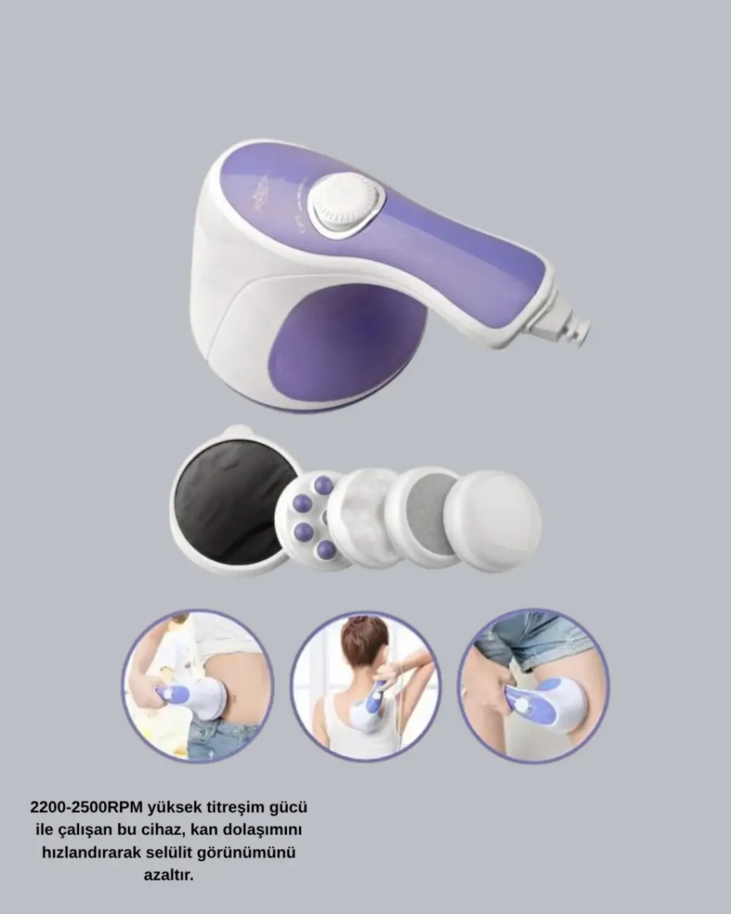 Fazla kilolarınızdan kurtulmak ve daha sıkı bir vücut formuna kavuşmak artık çok daha kolay! Bu elektrikli yağ yakıcı masaj aleti, 2200-2500 RPM arasında değişen yüksek titreşim gücüyle çalışarak kan dolaşımını hızlandırır, vücuttaki fazla yağın yakılmasına yardımcı olur ve selülit görünümünü azaltır.Cihaz, 5 farklı değiştirilebilir başlığı sayesinde vücudun farklı bölgelerine uygun şekilde kullanılabilir: karın, bacak, kalça, kol ve sırt gibi alanlarda etkilidir. Her başlık, farklı masaj teknikleriyle cilt yüzeyini uyarır ve kasları rahatlatır.Düzenli kullanımda cilt daha sıkı, pürüzsüz ve canlı bir görünüme kavuşur. Ergonomik tasarımı sayesinde ele rahat oturur ve uzun süre kullanımda bile yorgunluk hissi oluşturmaz. Ayarlanabilir hız seçenekleri, kişisel ihtiyaçlarınıza göre kullanım kolaylığı sağlar.Evde profesyonel spa etkisi yaratan bu cihaz, hem yağ yakımı hem de kas rahatlatma işlevini bir arada sunar. Gündelik kullanım için idealdir, sessiz çalışır ve az enerji tüketir. Estetik merkezine gitmeden, kendi evinizde bölgesel incelme ve rahatlama deneyimi yaşayın!