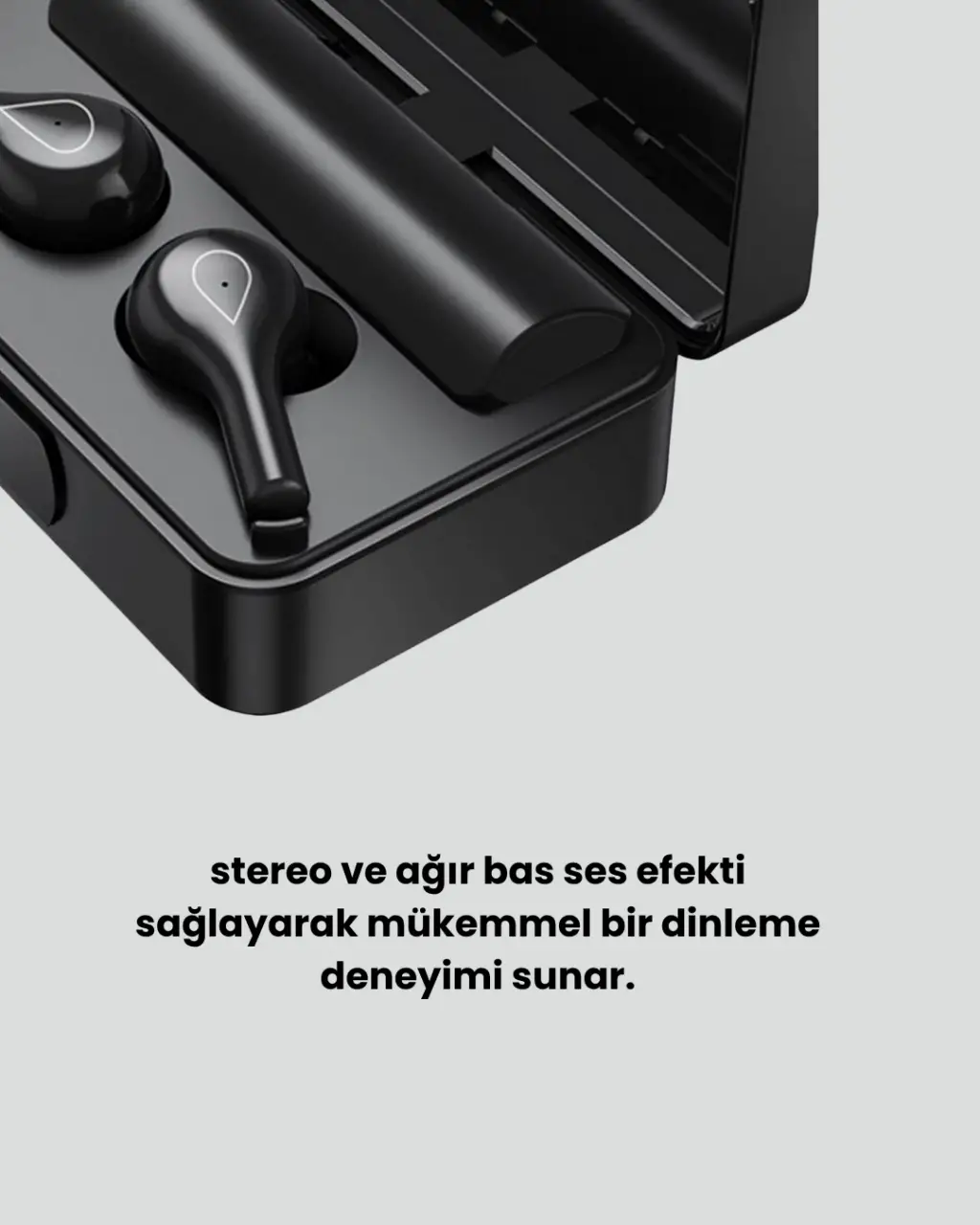 Bu Bluetooth kulaklık, yüksek kaliteli ses çıkışı ve dayanıklı tasarımı ile farklı kullanım senaryolarına uygundur. IPX su geçirmez yapısı sayesinde terlemeye karşı dayanıklıdır. Spor yaparken veya açık havada kullanıldığında da güven verir. BT5.1 teknolojisi ile donatılmış kulaklık, daha az enerji harcarken istikrarlı bir kablosuz bağlantı sunar. Şarj kutusu, 3500 mAh bataryası ile kulaklıkları birçok kez şarj edebilir. Ayrıca diğer cihazlar için yedek güç kaynağı olarak da kullanılabilir. Şarj kutusunun üzerindeki dijital ekran sayesinde pil durumu kolaylıkla takip edilebilir. Otomatik bağlantı ve dokunmatik kontrol özellikleri, kullanıcıya pratiklik sağlar. Kulaklık, sesli asistan desteği ve çağrı yönetimi gibi temel işlevleri destekler. Taşınabilir yapısı ve ergonomik formu ile günlük kullanımda rahatlık sunar. Şarj kutusunun ayna kaplaması estetik bir görünüm kazandırır.