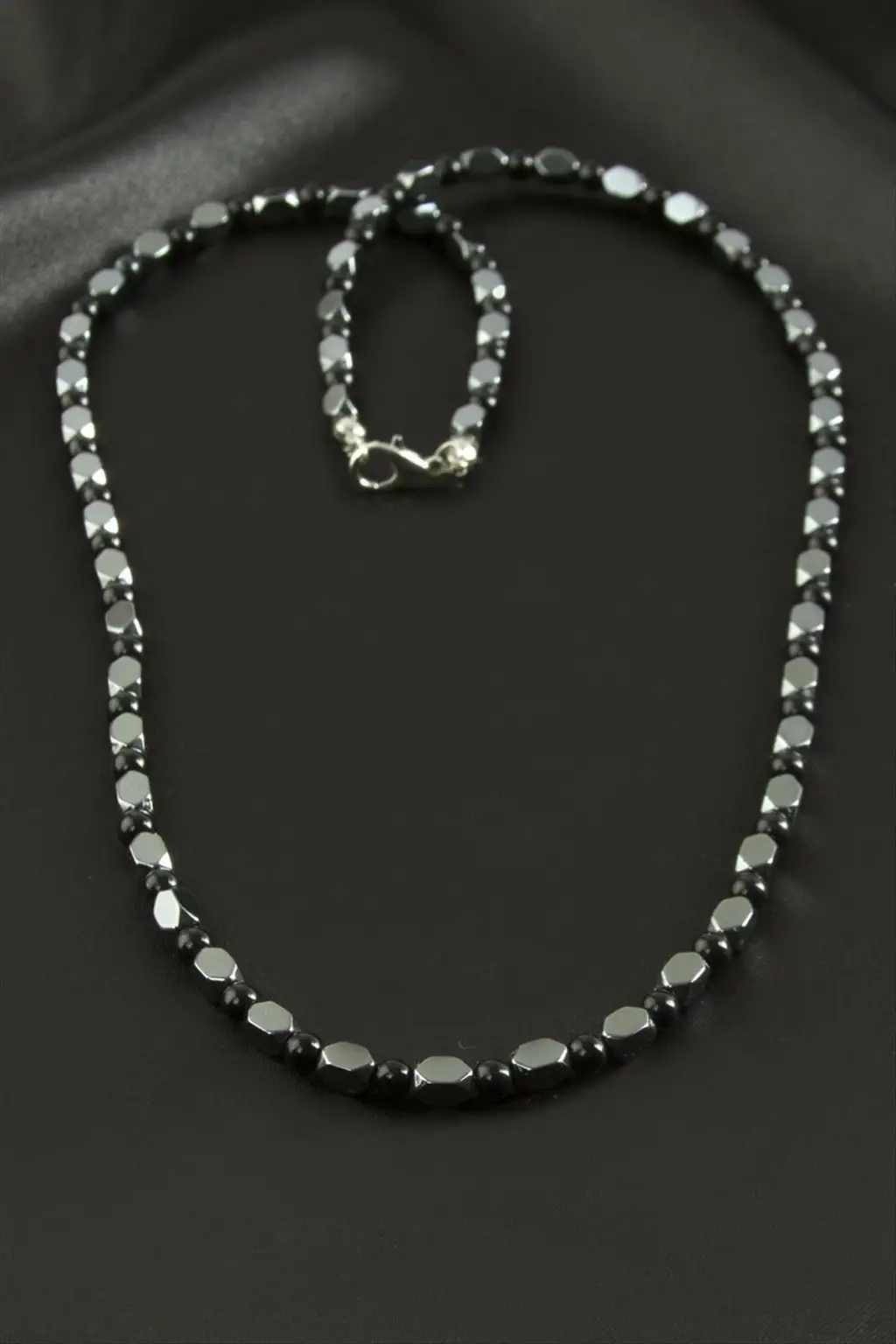 Kolye; Ürün malzemesi onix taş ve hematettir. Ürün boyu 55 cmdir. 1 sınıf kaliteli malzemeden üretilmiştir.
