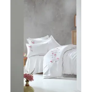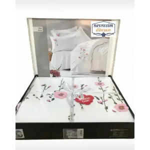 Cotton Box 3D Nakışlı Çift Kişilik Saten Nevresim Takımı Perla Beyaz