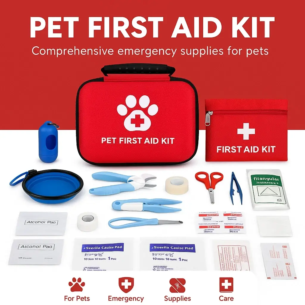 EVCİL HAYVAN LÜKS İLK YARDIM VE İHTİYAÇ SETİ ÇANTASIÜrün ÖzellikleriEvcil Hayvan Lüks İlk Yardım ve İhtiyaç Seti Çantası, evcil dostlarınızın acil durumlarda güvenliği ve sağlığı için özel olarak hazırlanmıştır. Dayanıklı yapısı sayesinde uzun süre kullanılabilir ve her an yanınızda bulundurabileceğiniz pratik bir üründür. İçerisinde gazlı bez, makas, bandaj ve benzeri temel ilk yardım malzemeleri düzenli şekilde yer almakta olup, seyahatlerde veya günlük kullanımda acil müdahaleler için idealdir. Kompakt tasarımı sayesinde kolayca taşınabilir ve saklanabilir. Kapalı formda kırmızı renkli çantasıyla dikkat çeker ve sağlık temasını güçlü bir şekilde yansıtır.1 adet Katlanabilir Mama Kabı1 adet Pire Tarağı1 adet Törpülü Tırnak Makası1 adet Çantalı Dışkı Poşeti1 adet Bandaj Rulo1 adet Hap Yutturma Atı6 adet Steril Gazlı Bez5 adet Yara Bandı1 adet Gazlı Bez Rulo4 adet Povidon-iyot Hazırlama Pedi10 adet Alkollü Temizleme Bezi1 adet Sargı Bandı Rulo1 adet Plastik Cımbız1 adet Makas1 adet Düdük1 adet Silikon Bandaj1 adet Üçgen Bandaj (96×96×136 cm)10 adet Çengelli İğne1 adet Basmalı CımbızPaket İçeriği1 x Evcil Hayvan İlk Yardım ve İhtiyaç Seti Çantası (tam dolu)