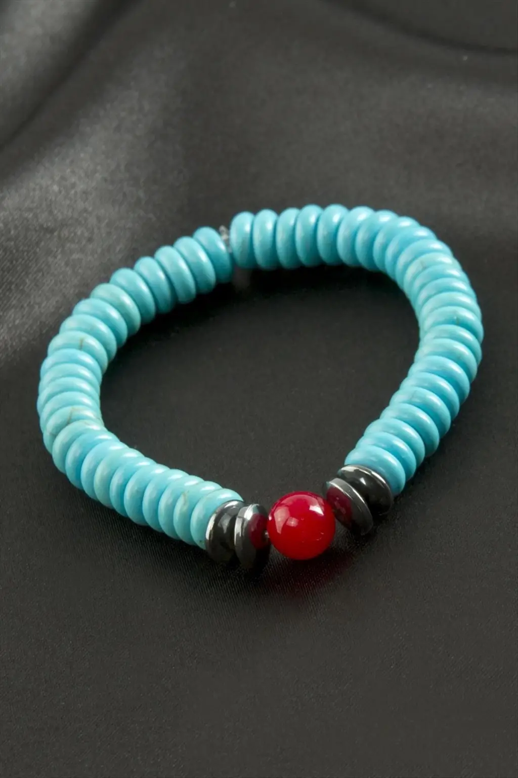 Bileklik: Ürün malzemesi firuze ve ceyt doğaltaşından imal edilmiştir. Misina üzerine dizilmiştir. Misina esneme özelliği bulunmaktadır.