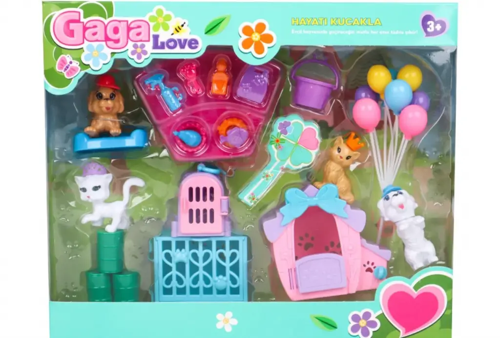 Set içerisinde ; 2 kedi, 2 köpek, taşıma kabı, kulübe, çeşitli bakım malzemeleri, kova ve balonlar bulunmaktadır.