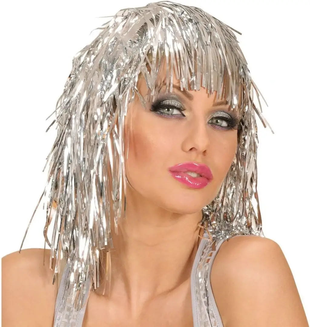 Parti tarzınıza parıltı katın! Göz alıcı metalize gümüş peruk, ışıltılı yapısıyla ışık altında mükemmel bir etki yaratır. Eğlenceli davetler, yılbaşı partileri, doğum günü kutlamaları, sahne gösterileri ve karnavallar için idealdir.