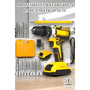 24 Parça Çift Bataryalı Şarjlı Matkap Seti 24W Motor ve Otomatik Mil Kilitli Tasarım