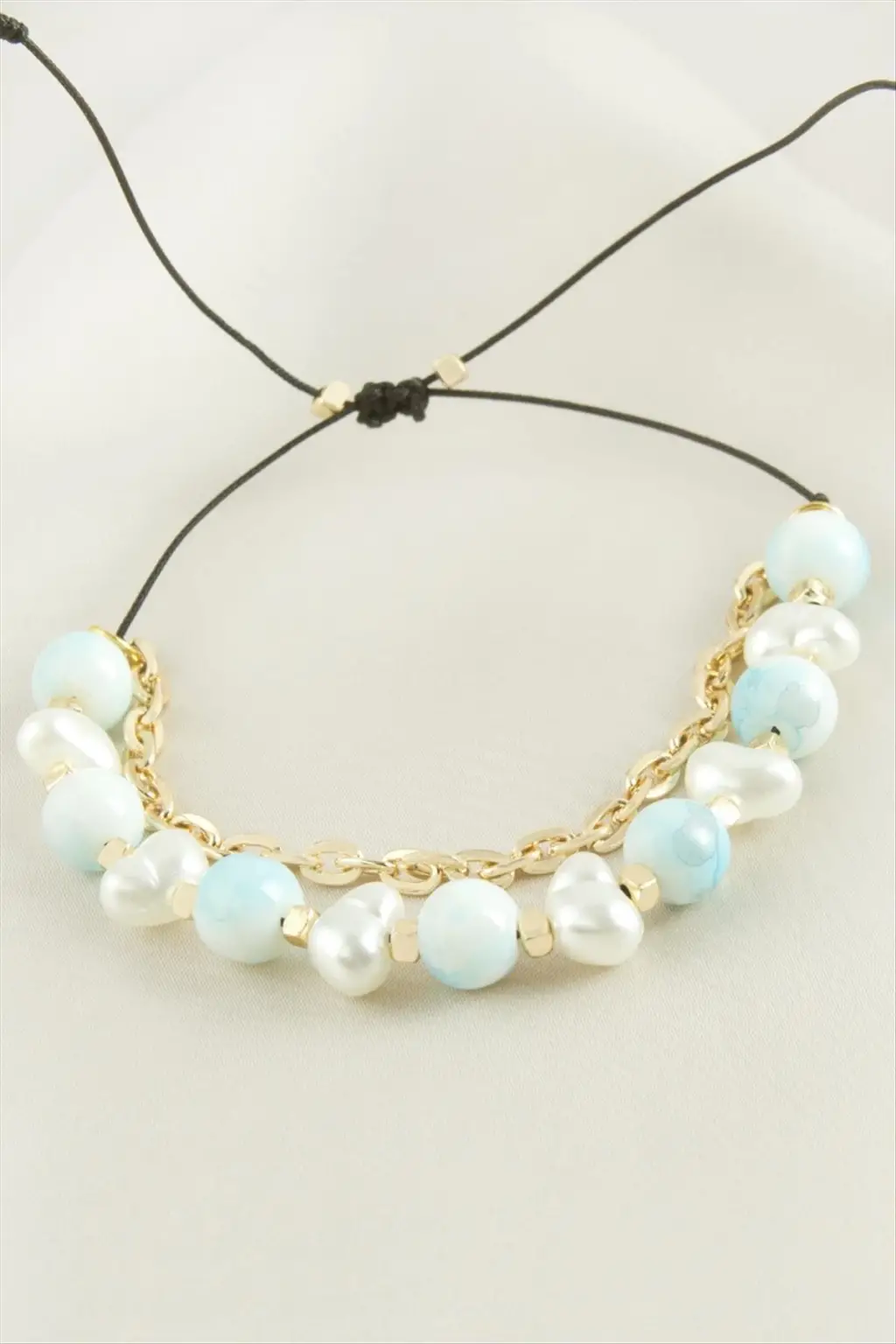 Bileklik; Ürün malzemesi metal, inci, boncuk ve makrome iptir. Arkası asansörlüdür Bileğe göre ayarlamalıdır. Kartlıdır.