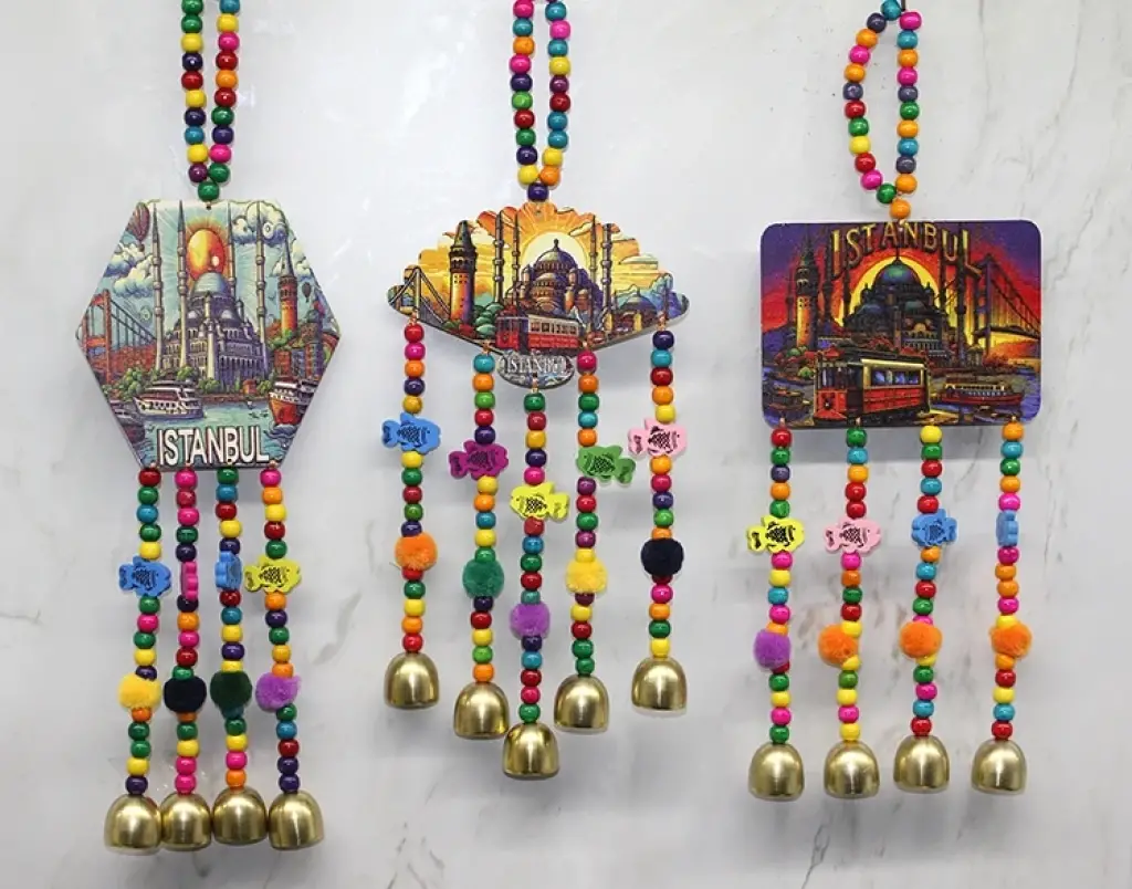 İSTANBUL TEMALI RENKLİ BONCUKLU ASMALI RÜZGAR ÇANIÜrün Özellikleriİstanbul Temalı Renkli Boncuklu Asmalı Rüzgar Çanı, geleneksel ve modern tasarımın birleştiği dekoratif bir aksesuar olup yaşam alanlarına neşeli ve kültürel bir hava katmak için ideal bir seçimdir. 36 cm boyutundaki yapısı sayesinde balkon, pencere, kapı girişleri, veranda ve iç mekan dekorasyonlarında rahatlıkla kullanılabilir. Üzerindeki İstanbul temalı baskılar ürüne nostaljik ve turistik bir karakter kazandırırken, renkli boncuklar ve alt kısımdaki çan detayları hareket ettikçe hoş bir tını oluşturur. Asma halkası sayesinde kolayca monte edilebilir. Model seçimi yapılamaz; görseldeki modellerden biri olarak gönderilir. Hem dekorasyon amacıyla hem de hediyelik olarak tercih edilebilecek şık ve anlamlı bir aksesuardır.Paket İçeriği1 adet İstanbul Temalı Renkli Boncuklu Asmalı Rüzgar Çanı