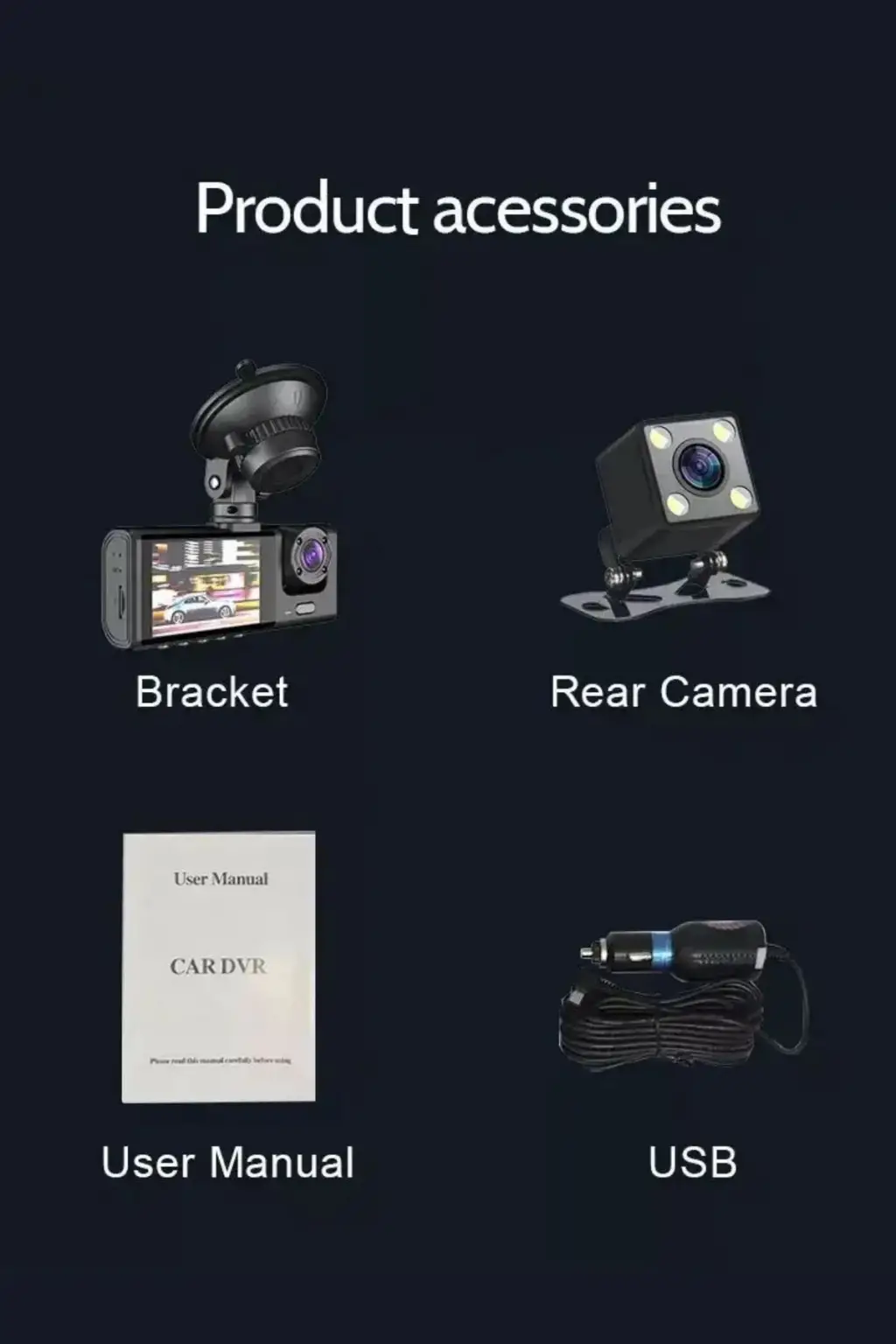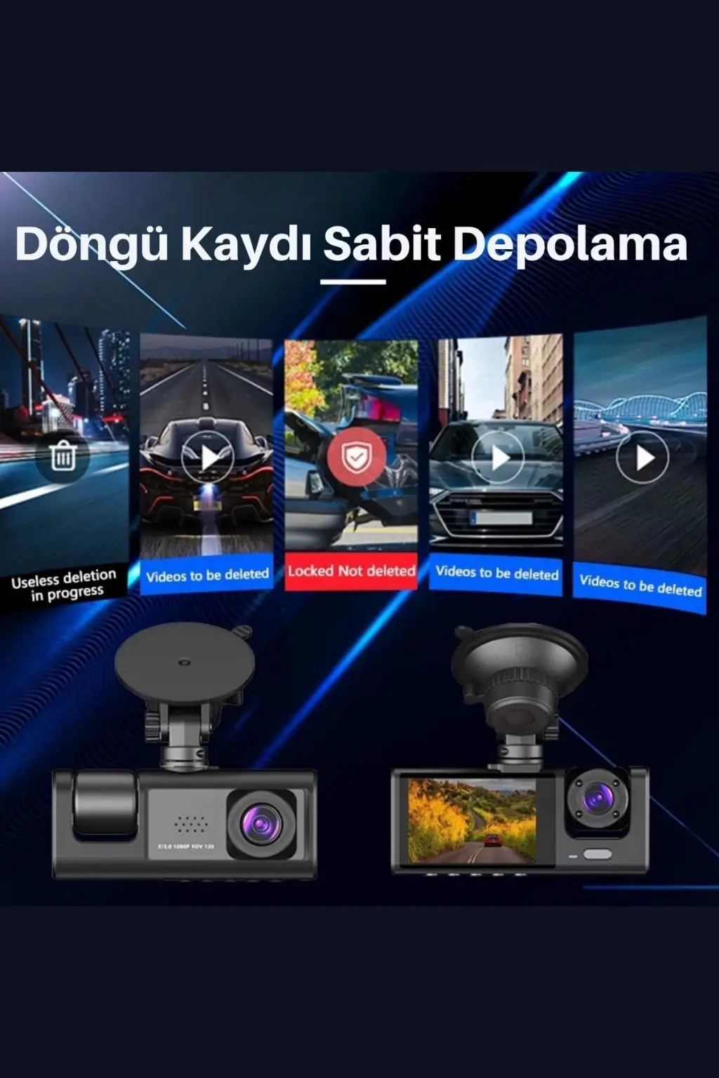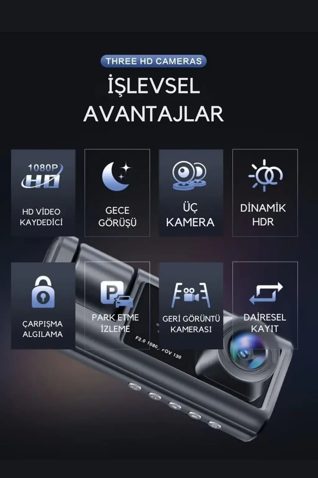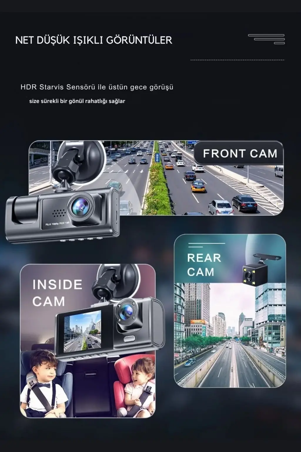 Wifi 1080p Araç içi 3 Kameralı Lcd Ekranlı Gece Görüşlü , G-sensör , Geri Görüş Kamera
