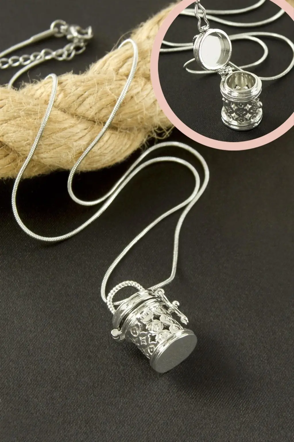 Kolye; Ürün malzemesi çeliktir. Ürün zincir boyu 45 cmdir. Ürün kafes boyu 1,5 cmdir. Kapağı açılıp kapanır.