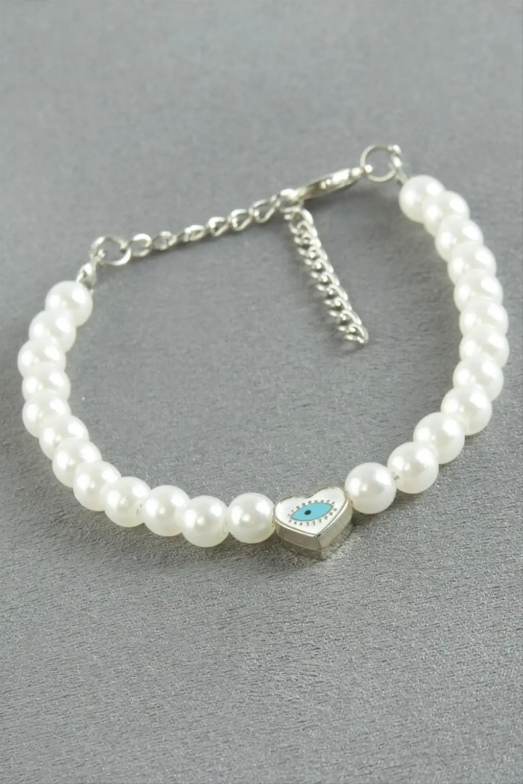Bileklik; Ürün malzemesi inci, mine boyama ve metaldir. Kartlıdır. Boyu 19 cmdir.