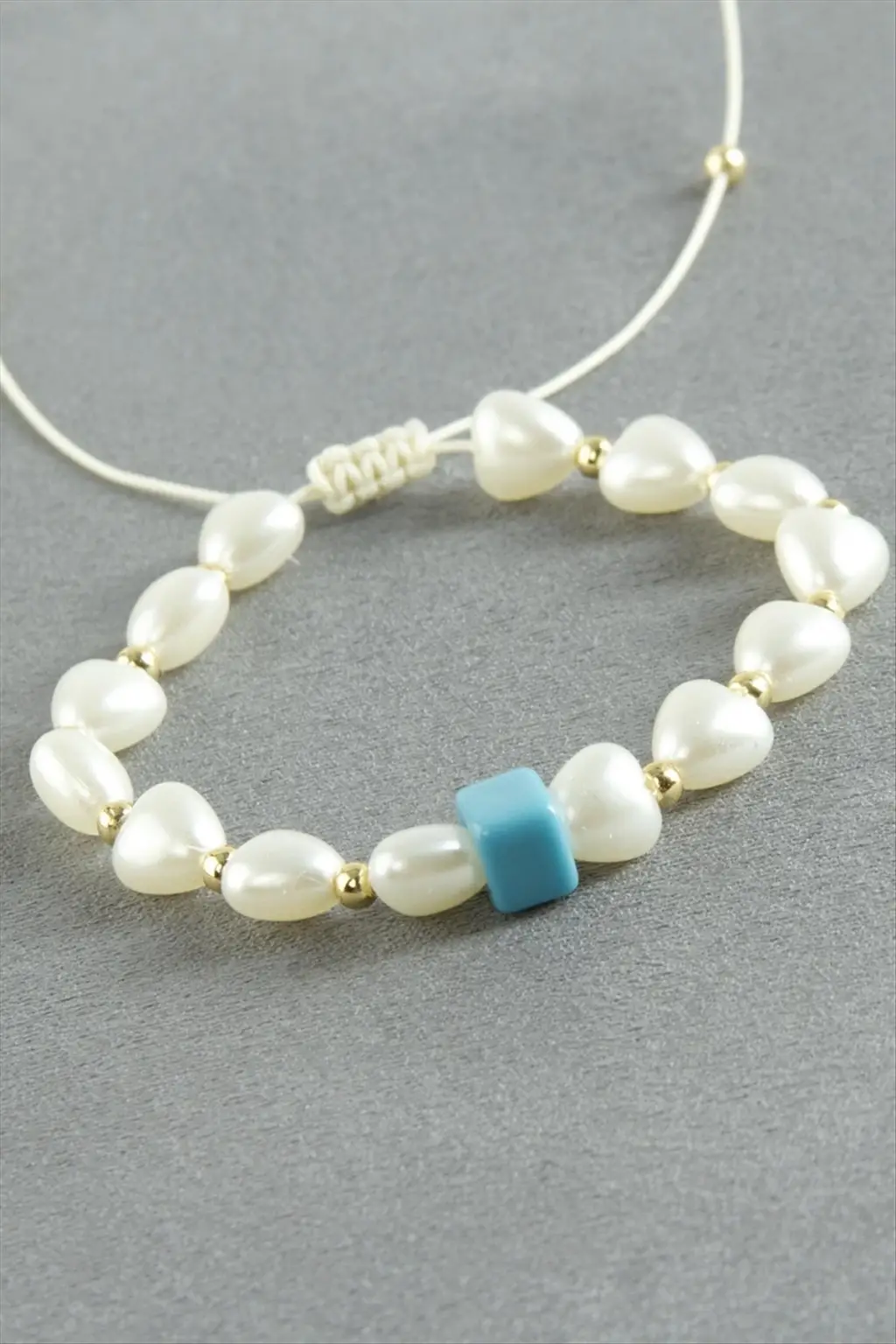 Bileklik; Ürün malzemesi inci ve makrome iptir. Ürün arkası asansörlüdür. Bileğe göre ayarlanabilir.
