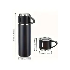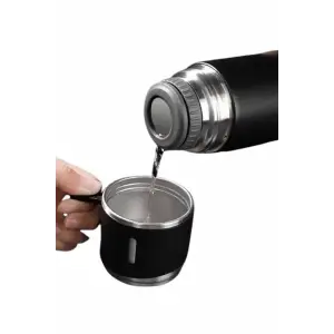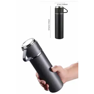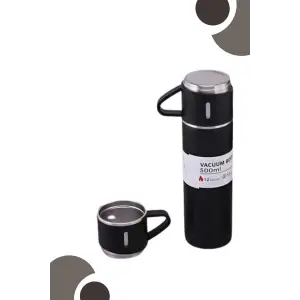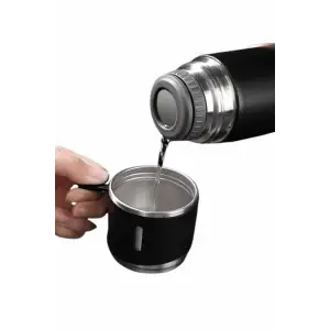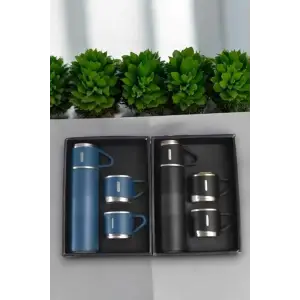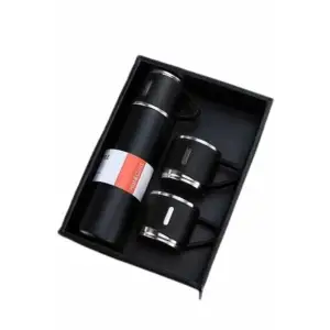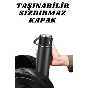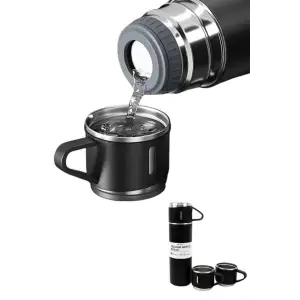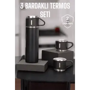 Termos Paslanmaz Çelik Termos Siyah Renk 3 Bardaklı Termos Seti
