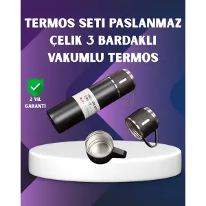 Termos Seti Paslanmaz Çelik 3 Bardaklı Vakumlu Termos Set 500 Ml 12 Saate Kadar Isı Koruma