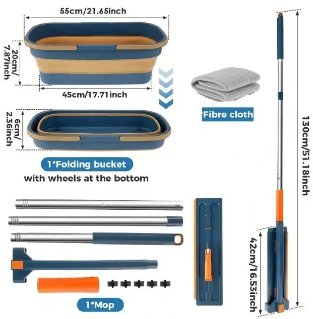 KATLANABİLİR TEMİZLİK MOPU VE TEKERLEKLİ KOVA SETİÜrün AçıklamasıEvinizin temizliği için tasarlanmış bu pratik temizlik seti, katlanabilir bir kova ve esnek mop ile birlikte gelir. Tekerlekli kovası sayesinde taşıması son derece kolaydır. Mopun uzun ve ayarlanabilir sapı, temizlik sırasında eğilmeye gerek bırakmaz, rahat bir kullanım sunar. Kova, yerden tasarruf sağlayan katlanabilir bir tasarıma sahiptir ve kullanılmadığında kolayca saklanabilir. Mikrofiber mop bezi, toz ve kiri etkili bir şekilde toplar ve her türlü yüzeyde derinlemesine temizlik sağlar.Ürün ÖzellikleriKova Boyutları: 55 cm x 27 cm x 20 cm (tam açık), 6 cm yükseklik (katlanmış)Mop Uzunluğu: Maksimum 130 cmMalzeme: Dayanıklı plastik kova, paslanmaz çelik mop sapıKullanım Alanı: Fayans, parke, mermer gibi tüm zeminlerEk Özellikler: Tekerlekli kova, katlanabilir tasarım, mikrofiber bezPAKET İÇERİĞİ1 x Katlanabilir tekerlekli kova1 x Mikrofiber mop bezi1 x Ayarlanabilir mop sapı