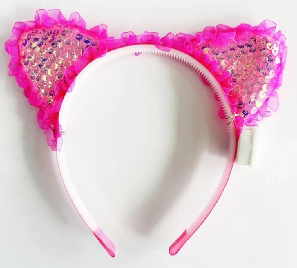 Eğlencenin ve şıklığın bir araya geldiği Kenarları Dantelli Fuşya Pullu Payetli Led Işıklı Kedi Kulak Taç ile partilerin yıldızı olun!