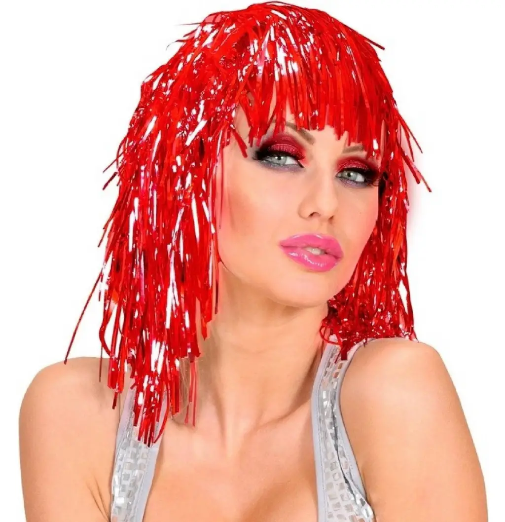 Sahnelerin yıldızı olun! Metalize kırmızı peruk, cesur ve dikkat çekici görünümüyle her ortamda fark yaratır. Parlak folyo yapısı sayesinde ışık altında büyüleyici bir ışıltı sunar.