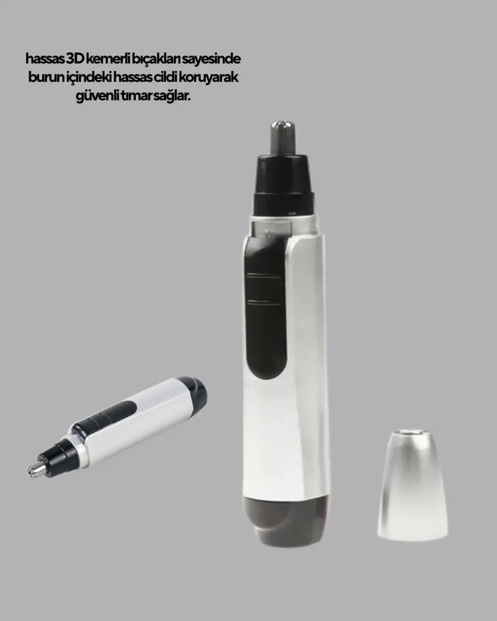 Kişisel bakımda pratiklik ve güvenliği bir arada sunan Kişisel Burun ve Kulak Tıraş Makinesi, hassas bölgelerde etkili ve konforlu bir tıraş deneyimi sağlar.Yüksek kaliteli paslanmaz çelikten üretilen 3D kavisli bıçak sistemi, burun içi, kulak ve kaş çevresinde güvenli kesim yaparak tahrişi önler.Açık yarık tasarımı, tüylerin farklı yönlerden kolayca alınmasına olanak tanır.Ergonomik gövde tasarımı, cihazın elinizde kaymadan rahatça tutulmasını sağlar.Kompakt ve hafif yapısı sayesinde seyahatlerde kolayca yanınızda taşınabilir.Evde, işte veya tatilde bakımınızı aksatmadan her an düzenli bir görünüm elde etmenize yardımcı olur.Cihaz, 1 adet AA pil ile çalışır (pil dahil değildir) ve pil sistemi sayesinde kabloya ihtiyaç duymadan özgür kullanım imkânı sunar.Kolay temizlenebilir başlığı sayesinde hijyenik kullanım sağlar; su altında durulanabilir yapısı ile saniyeler içinde temizlenir.Burun, kulak ve kaş bakımını tek bir cihazda birleştiren bu tıraş makinesi, hem erkekler hem de kadınlar için ideal bir kişisel bakım aracıdır.Zahmetsiz, güvenli ve etkili bir tımar deneyimi için mükemmel bir tercihtir.