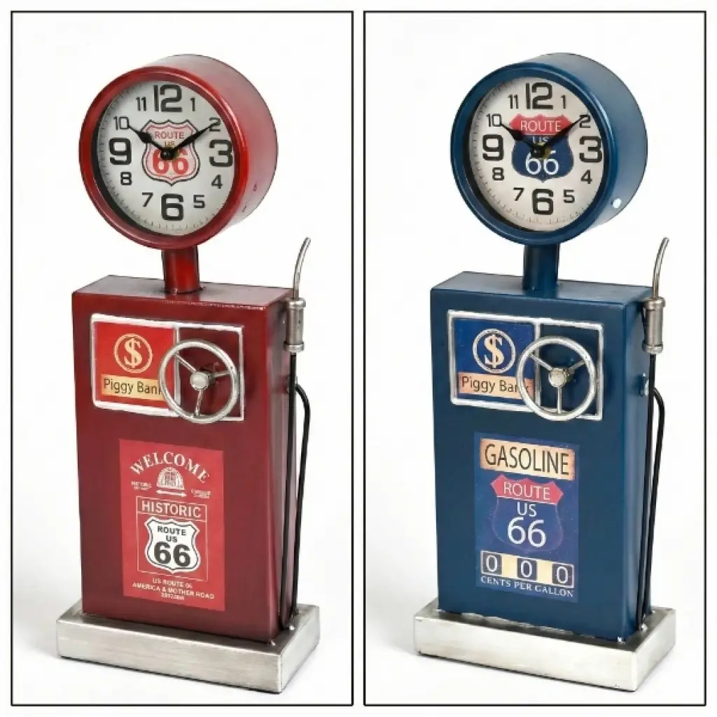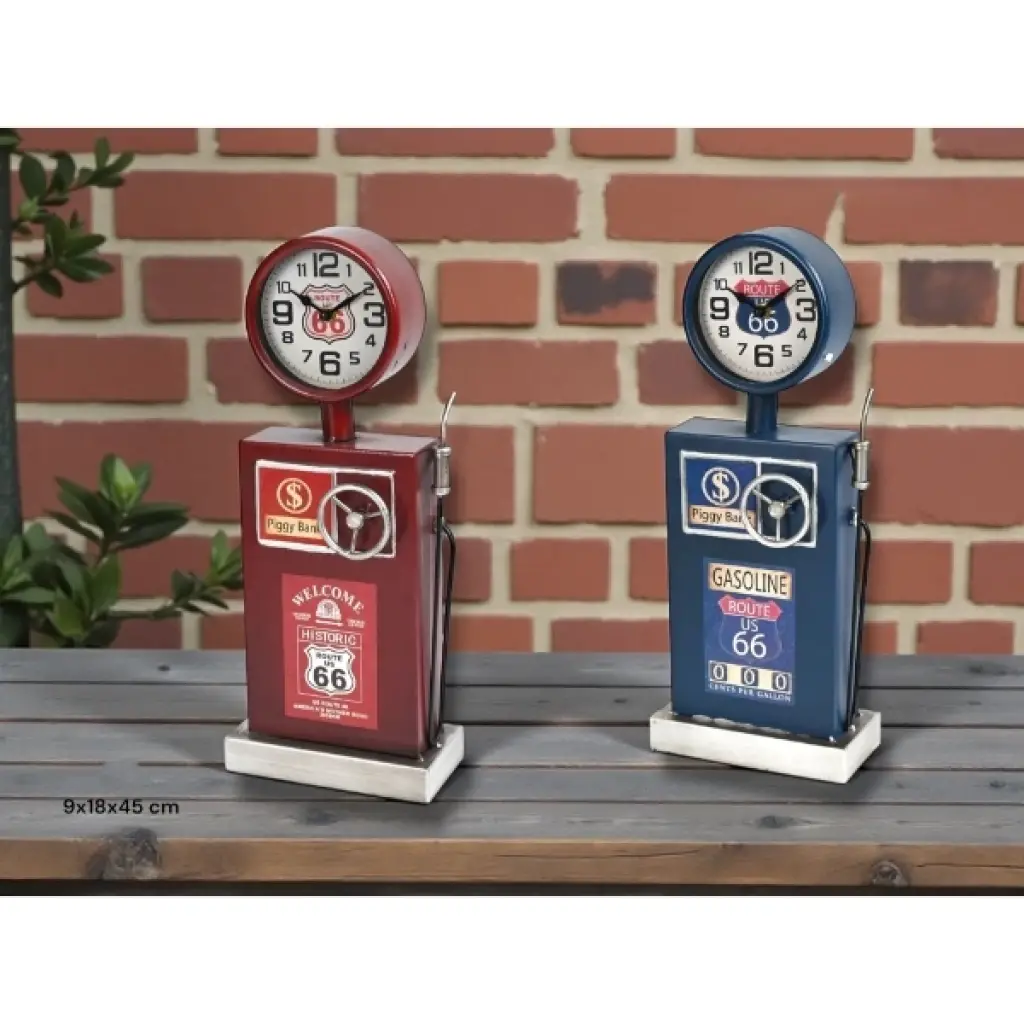 KLASİK BENZİNLİK TASARIMLI MASAÜSTÜ SAATÜrün ÖzellikleriKlasik benzinlik tasarımlı masaüstü saat, nostaljik benzin istasyonlarından ilham alan özgün gövde yapısı ve Route 66 temalı detaylarıyla dekorasyona karakter kazandıran özel bir modeldir. Dikey formu ve üst bölümde konumlandırılmış yuvarlak saat kadranı, klasik masa saatlerinden ayrışarak güçlü bir görsel etki oluşturur. Gövde üzerinde yer alan benzin pompası hortumu, vana ve retro grafik baskılar ürüne gerçekçi ve koleksiyonluk bir görünüm kazandırır. Net ve büyük rakamlara sahip analog kadranı sayesinde saat kolayca okunabilir ve hem dekoratif hem işlevsel bir kullanım sunar. 9x18x45 cm ölçüleriyle masa, raf, konsol, kitaplık veya vitrin üzerinde dikkat çekici bir duruş sergiler. Sessiz çalışan mekanizması sayesinde ofis, çalışma odası veya yaşam alanlarında rahatsız edici bir ses oluşturmaz. Dayanıklı malzemeden üretilmiş yapısı uzun ömürlü kullanım sağlar. Renk seçimi yapılamamaktadır; ürün kırmızı veya mavi renk seçeneklerinden biri olacak şekilde gönderilmektedir. Retro, vintage ve endüstriyel dekorasyon tarzlarını tamamlayan bu masaüstü saat, dekoratif obje arayanlar için ideal bir tercihtir.Paket İçeriği1 adet klasik benzinlik tasarımlı masaüstü saat