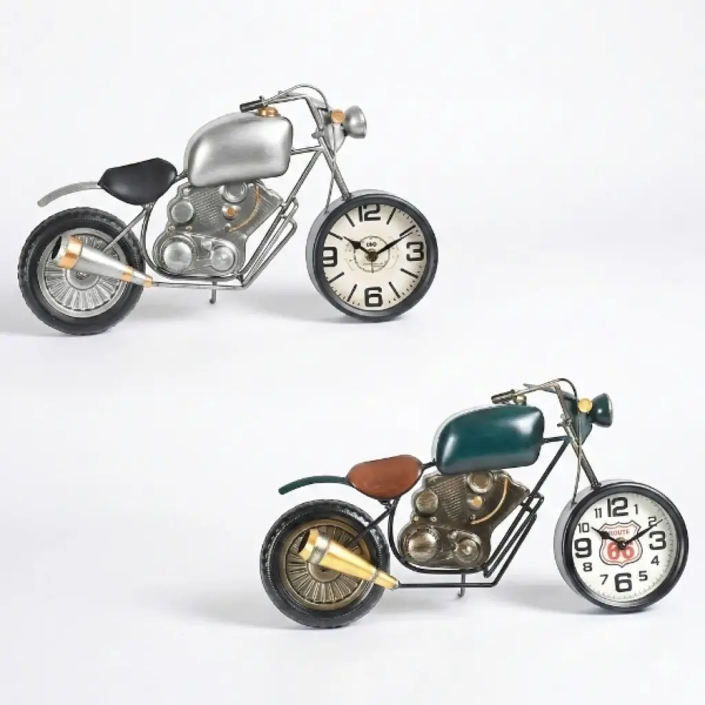 KLASİK MOTOR TASARIMLI MASAÜSTÜ SAATÜrün ÖzellikleriKlasik motor tasarımlı masaüstü saat, retro motosiklet estetiğini dekoratif bir saat formuyla buluşturan özgün ve dikkat çekici bir tasarıma sahiptir. Gövdesi klasik chopper tarzı motor detaylarıyla şekillendirilmiş olup, metal görünümlü motor bloğu, egzoz, sele ve jant detayları sayesinde gerçekçi bir obje hissi sunar. Ön tekerlek kısmına entegre edilmiş analog saat kadranı, büyük ve net rakamları sayesinde kolay okunabilirlik sağlar ve dekoratif yapısını işlevsellikle tamamlar. 45x25 cm ölçüleriyle masa, raf, konsol veya vitrin üzerinde güçlü bir duruş sergileyerek ortamın odak noktası haline gelir. Sessiz çalışan mekanizması sayesinde ofis, çalışma odası veya yaşam alanlarında rahatsız edici bir ses oluşturmaz. Retro, endüstriyel ve vintage dekorasyon stilleriyle uyumlu yapısı sayesinde kafe, ofis ve ev dekorasyonlarında estetik bir tamamlayıcı olarak kullanılabilir. Renk seçimi yapılamamaktadır; ürün, görsellerde yer alan motor modellerinden biri olacak şekilde olarak gönderilmektedir. Koleksiyonluk görünümü ve detaylı işçiliğiyle hediye alternatifi olarak da öne çıkan bir masaüstü saat modelidir.Paket İçeriği1 adet klasik motor tasarımlı masaüstü saat