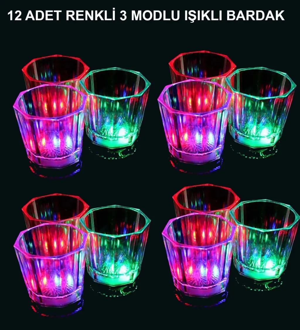 12'li Renkli LED Işıklı Bardak – 3 Modlu Dekoratif İçki Bardağı