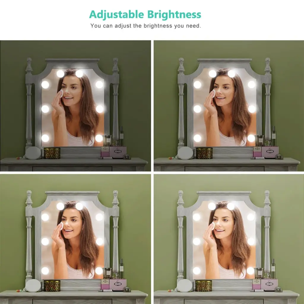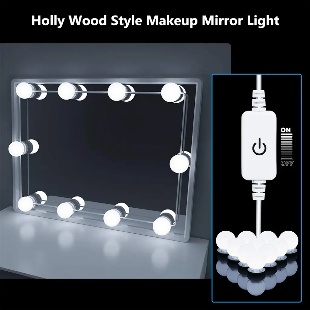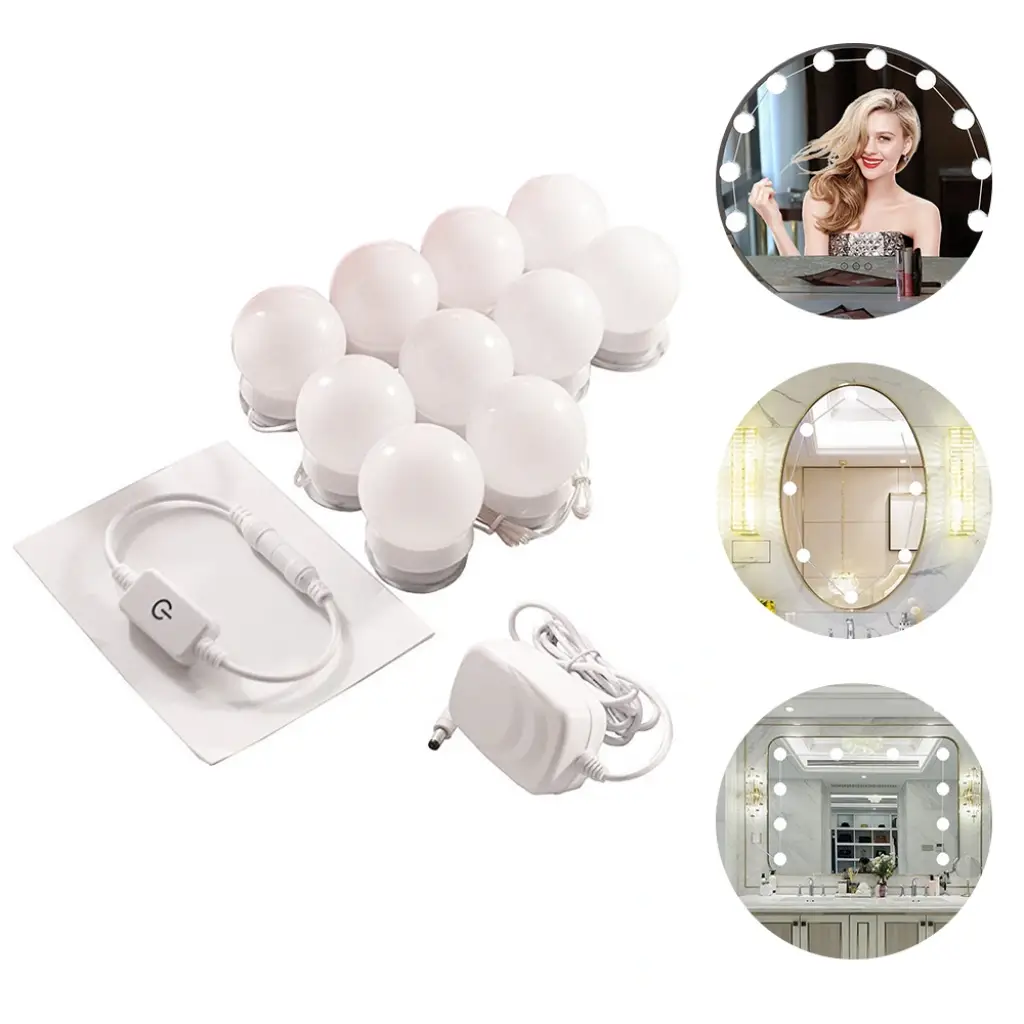 MAKYAJ AYNASI AYDINLATMA KİTİÜrün ÖzellikleriDC 12V çıkış voltajı, kullanımı güvenlidir. 10 adet G5 modern küresel ampul.Yapışabilir ışık pürüzsüz yüzey doğrudan veya kullanım vidaları (dahil değildir) işığı düzeltmek için. Her bir ampulün altındaki bir tel yuvasında yerleşik olarak, yedek kabloyu içine koymanıza izin verir, maks. Her lamba arasındaki mesafe 25.5cm, ampul tel uzunluğunu ihtiyacınıza göre ayarlayın.Yenilik dokunmatik kontrol anahtarı ve kademesiz dimmer. Göz kamaştırıcı değil, kademesi kısılabilir, uzun dokunmatik dimmer ile parlaklığı 20% ila 100% arasında ayarlayın.Karartma hafıza fonksiyonuna sahiptir.Paket İçeriği1 adet makyaj aynası aydınlatma kiti ( 10 adet ampul)