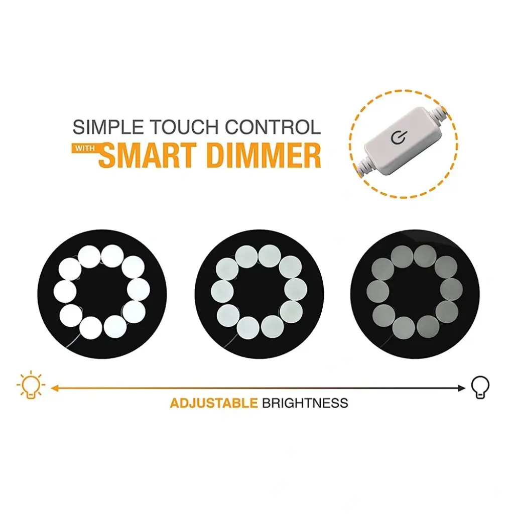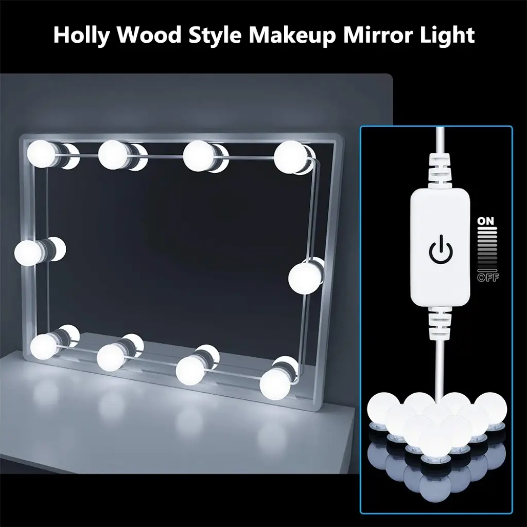 MAKYAJ AYNASI AYDINLATMA KİTİÜrün ÖzellikleriDC 12V çıkış voltajı, kullanımı güvenlidir. 10 adet G5 modern küresel ampul.Yapışabilir ışık pürüzsüz yüzey doğrudan veya kullanım vidaları (dahil değildir) işığı düzeltmek için. Her bir ampulün altındaki bir tel yuvasında yerleşik olarak, yedek kabloyu içine koymanıza izin verir, maks. Her lamba arasındaki mesafe 25.5cm, ampul tel uzunluğunu ihtiyacınıza göre ayarlayın.Yenilik dokunmatik kontrol anahtarı ve kademesiz dimmer. Göz kamaştırıcı değil, kademesi kısılabilir, uzun dokunmatik dimmer ile parlaklığı 20% ila 100% arasında ayarlayın.Karartma hafıza fonksiyonuna sahiptir.Paket İçeriği1 adet makyaj aynası aydınlatma kiti ( 10 adet ampul)