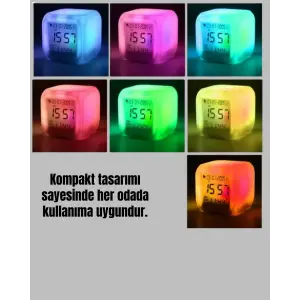 Termometre ve Takvim Özellikli 7 Renk Değiştiren Küp Alarm Saati