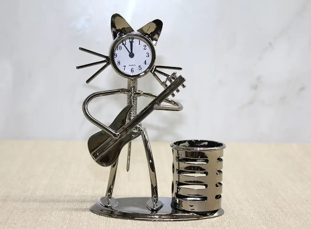 METAL GİTAR ÇALAN MÜZİSYEN KEDİ SAAT VE KALEMLİK Ürün ÖzellikleriMetal gitar çalan müzisyen kedi figürü, masaüstü dekorasyonunda şıklığı ve eğlenceli bir atmosferi bir araya getirir. Sanatsal detaylarla işlenmiş metal gövdesi, hem dayanıklılığı hem de estetik tasarımıyla öne çıkar. Üzerinde yer alan saat, dekoratif görünümüne işlevsellik katarken yanındaki kalemlik bölümü ise masanızı düzenli tutmaya yardımcı olur. 17x12 cm ölçüleriyle kompakt yapısı sayesinde fazla yer kaplamaz ve hediye alternatifi olarak da tercih edilebilir.Paket İçeriği1 adet Metal Gitar Çalan Müzisyen Kedi Saat Ve Kalemlik