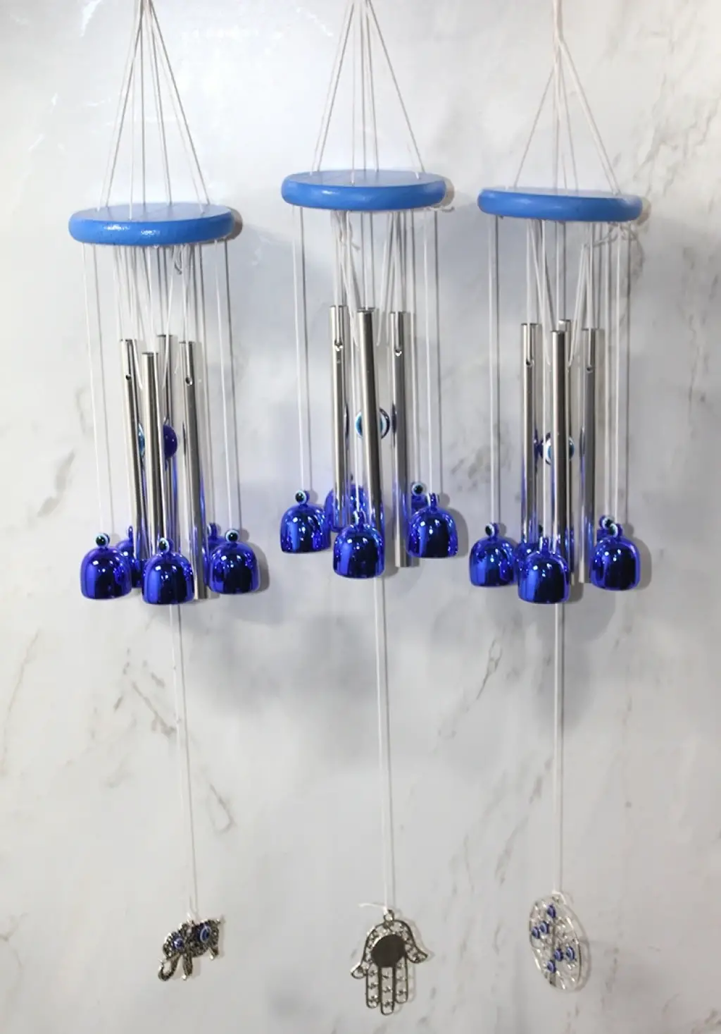 METAL RÜZGAR ÇANI MODEL 2Ürün ÖzellikleriMetal Rüzgar Çanı Model 2, göz alıcı mavi tonları ve dekoratif metal süslemeleri ile estetik bir atmosfer yaratır. Dayanıklı metal borular ve çanlarla tasarlanmış olup, hafif esintilerle huzur veren melodiler oluşturur. Nazar boncuğu ve mistik sembollerle süslenmiş detayları, hem dekoratif hem de geleneksel anlam taşır. Bahçe, balkon, veranda veya iç mekân süslemesi için şık bir seçenektir.Paket İçeriği1 Adet Metal Rüzgar Çanı