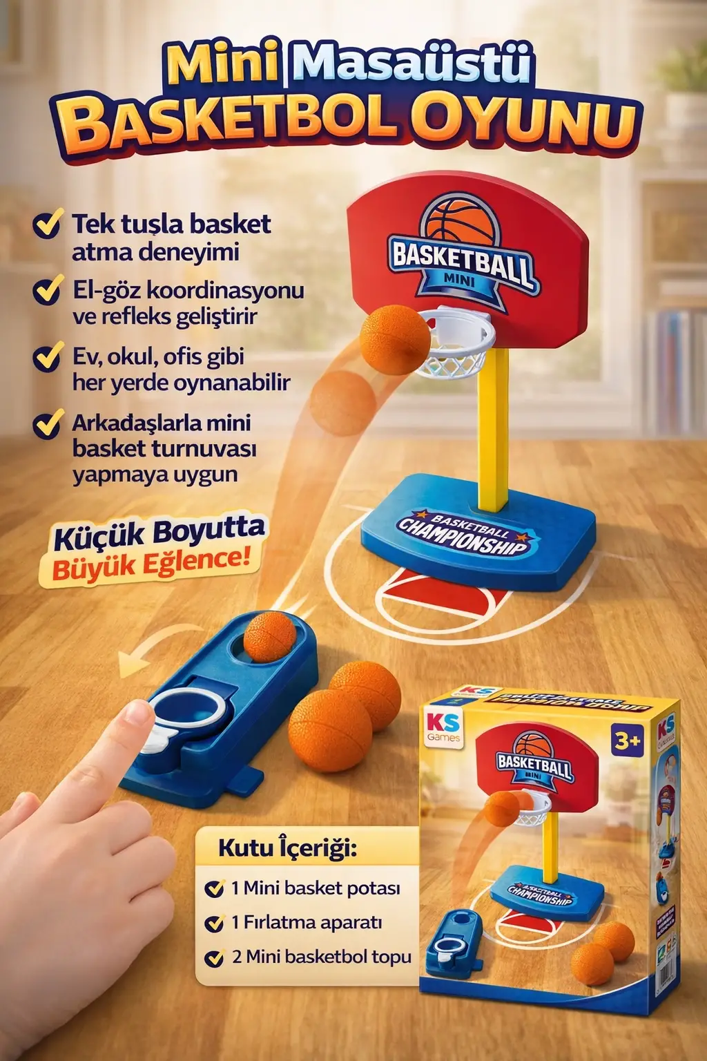 Renkli ve dikkat çekici tasarımı, sağlam pota yapısı ve mini basketbol toplarıyla çocukların ilgisini anında çeker. Küçük boyutu sayesinde masa üzerinde rahatlıkla oynanabilir; evde, okulda, kreşte veya ofiste kullanıma uygundur.