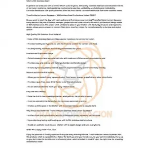 Büyük kapasite : Bu manuel limon sıkacağı çoğunlukla diğer manuel limon sıkıcılarından daha büyüktür. Limon veya turunçgilleri küçük parçalara ayırmanıza gerek yoktur, meyve suyunuzda tohum veya posa izi bırakmadan bir fincan meyve suyu sıkar