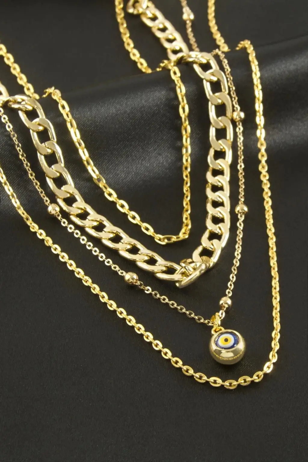 Kolye; Ürün malzemesi nazar boncuk ve metaldir. Ürün zincir uzunluğu 60 cmdir. Kartlı ve paketiyle beraber gönderilecektir. 4 zincirden üretilmiştir.