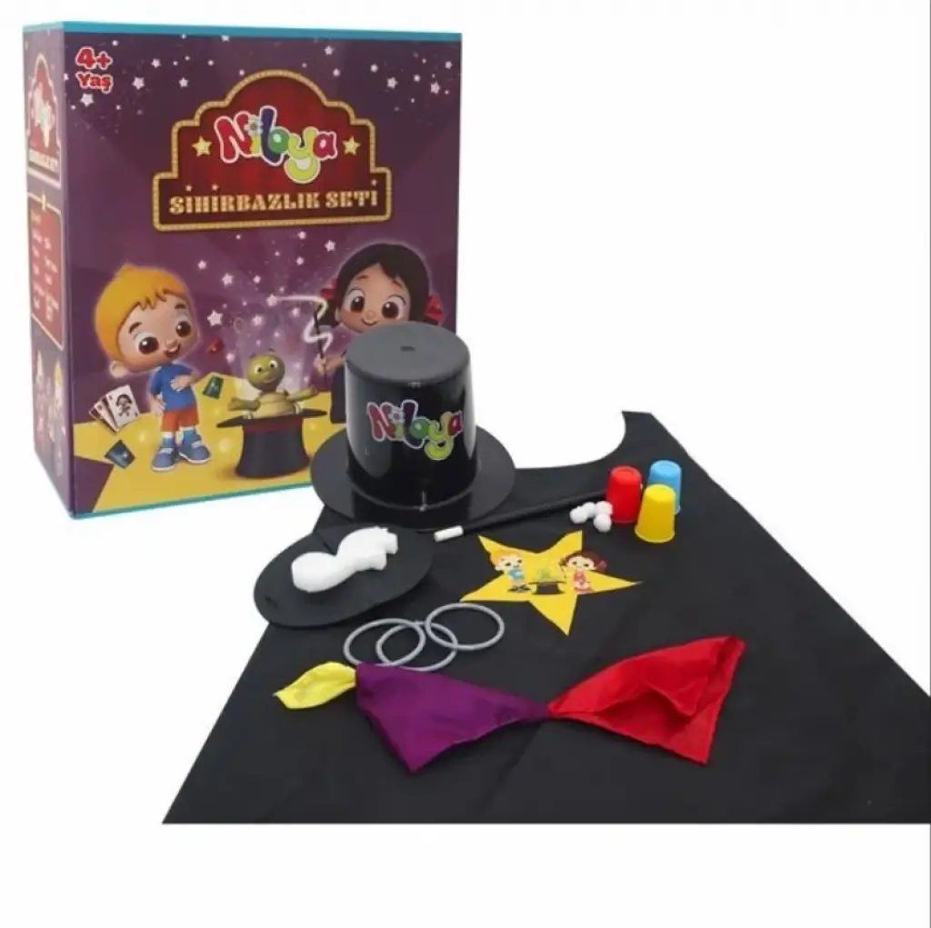 Kutu İçeriği : Sihirli şapka, pelerin, değnek, mendil, 3 lü halka, 3 bardak, oyun kartları, sünger kaplumbağa, sihir numaraları ile ilgili kullanma klavuzu.