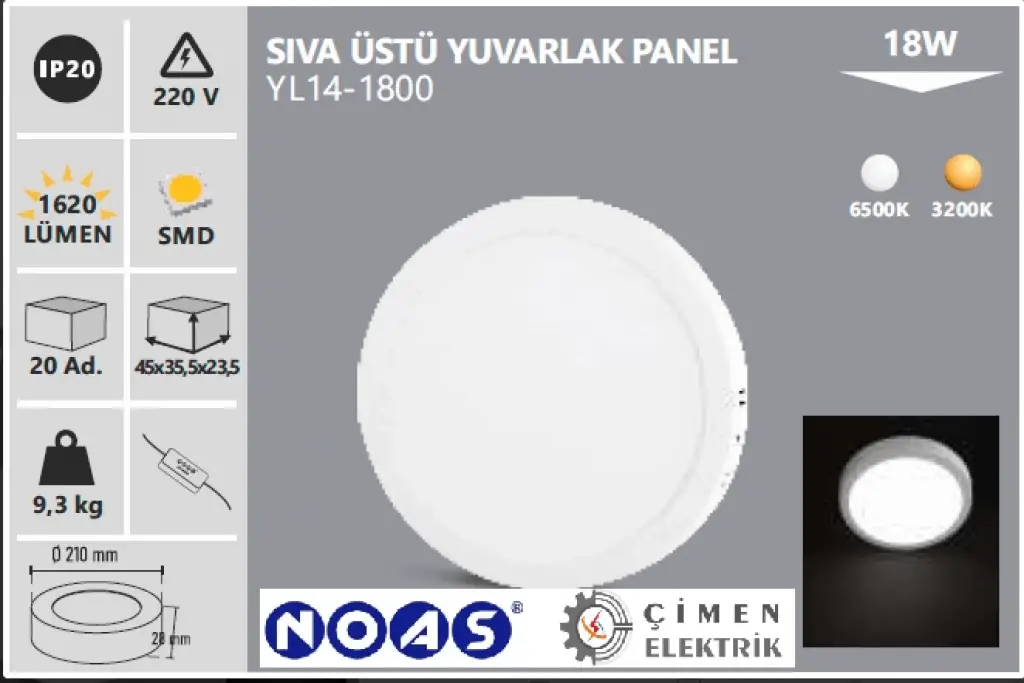 NOAS YL14 1800 18W Yuvarlak Sıva Üstü LED Panel, modern tasarımı ve güçlü aydınlatmasıyla hem ev hem de ticari alanlarda en ideal çözümlerden biri olarak öne çıkıyor. 6500K beyaz ışığı ile göz yormayan, doğal bir aydınlatma sunar. Kolay montajı ve enerji tasarruflu yapısı ile bütçenize ve çevreye dost bir üründür.