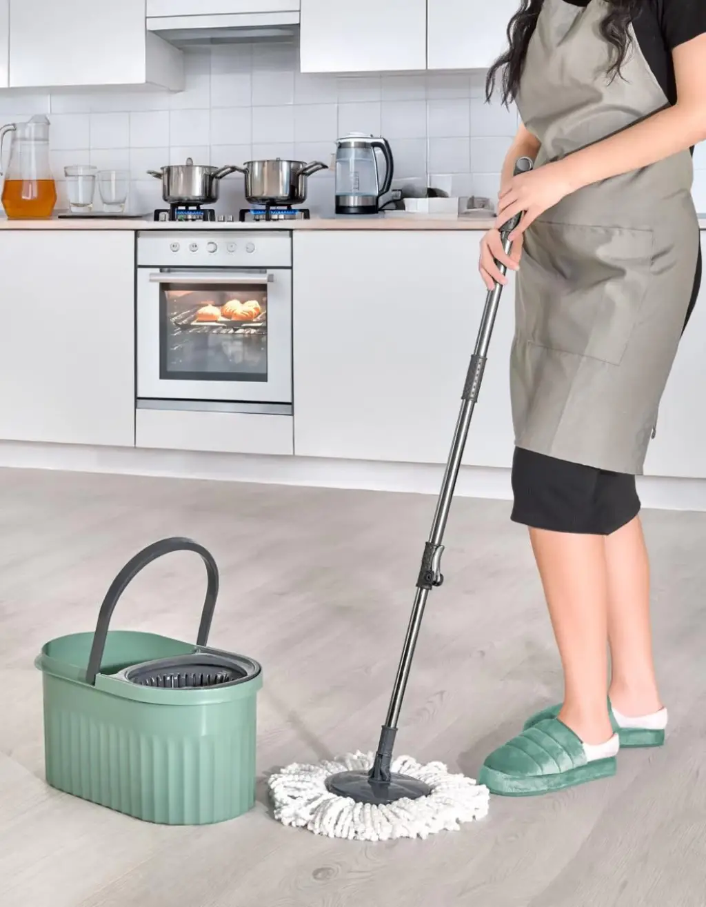 Otomatik Mop Seti Paspas ve Sıkma Kovası, 360° Döner Başlıklı Mikrofiber Yer Temizleme yeşil