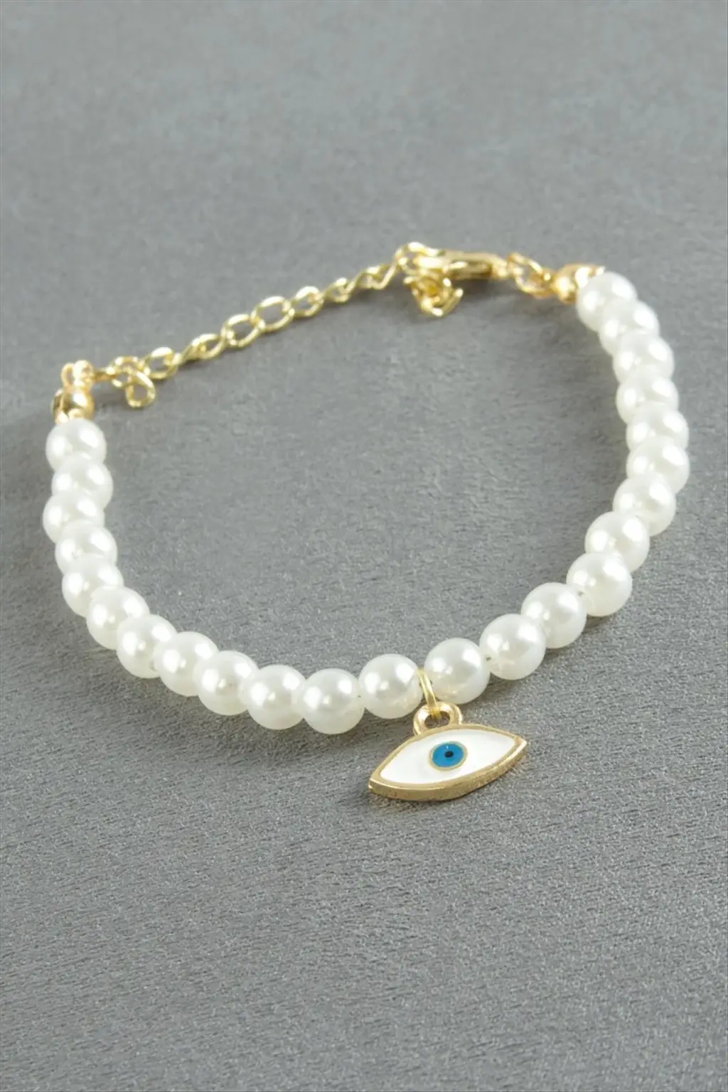 Bileklik; Ürün malzemesi inci, mine boyama ve metaldir. Kartlıdır. Boyu 19 cmdir.