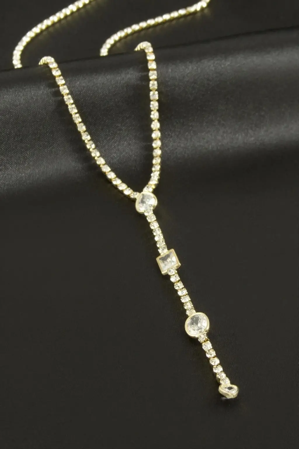 Kolye; Ürün malzemesi taş ve çeliktir. Ürün boyu 45 cmdir. Ucundaki sallantılı zincir bölümü uzunluğu 13 cmdir. Taş boyu 2 mmdir.