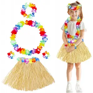Yetişkin Çocuk Hawaii Parti Seti - 40 cm Naturel Etek + Çiçek Aksesuarlar (5 Parça)