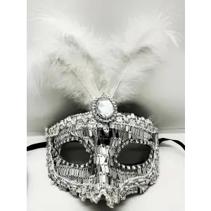 Gümüş Renk Payetli Pullu Tüylü Parti Maskesi 17x20 cm
