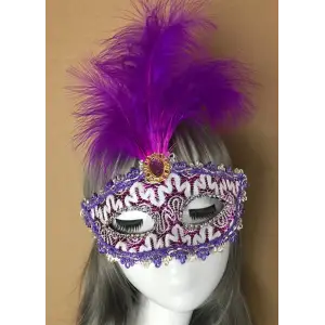 Mor Dantel İşlemeli Mor Tüylü Balo Parti Maskesi 17x20 cm