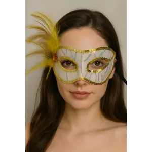 Altın Renk Yandan Tüylü Pul Payet İşlemeli Parti Maskesi 23x12 cm