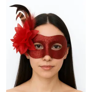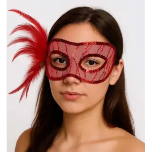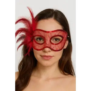 Kırmızı Renk Yandan Tüylü Pul Payet İşlemeli Parti Maskesi 23x12 cm