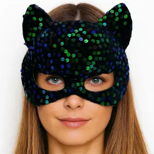 Siyah Kadife Kumaş Üzerine Mavi Yeşil Payetli Pullu Parti Maskesi 16x14 cm