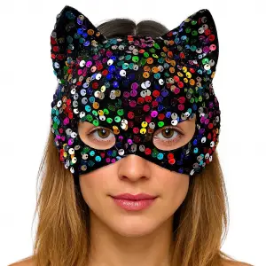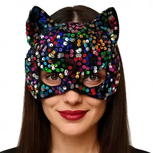 Siyah Kadife Kumaş Üzerine Rengarenk Payetli Pullu Parti Maskesi 16x14 cm